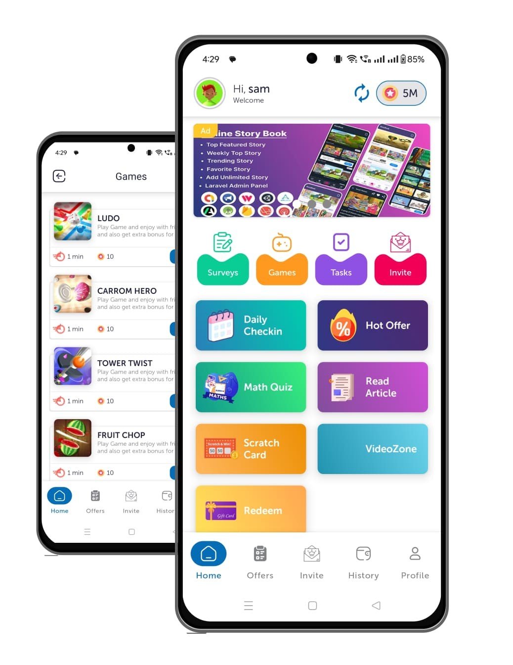 Play Games, Daily Task, Spin and Scratch, Math Quize, Refer Earn
